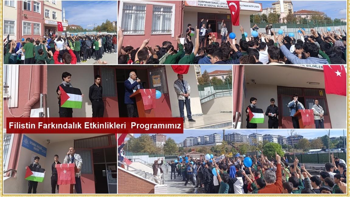 Filistin farkındalık etkinlikeri kapsamında okulumuzda öğretmen ve öğrencilerimize mavi kurdele bileklik dağıttık. Mescidimizde öğrencilerimiz tarafından Kuran-ı Kerim tilavetleri ve dualar edildi. Pano düzenleme çalışmaları yapıldı. 8 Ekim Çarşamba günüde okul bahçemizde program düzenledik. Programda önce İstiklal Marşı'mız okundu ardından Okul Müdürümüz Medeni KAVAK günün anlam ve önemini ifde eden konuşmasını gerçekleştirdi. Ardından Müdür Yardımcısı Ramazan ERCAN Filistin tarihini anlattığı konuşmasını yaptı öğrencilerimiz tarafından şiirler okundu.
